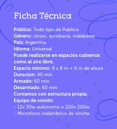 Comedia circense para toda la familia, una tía y su sobrino los harán emocionar, reír y sorprender a través de las diferentes rutinas del circo: malabares, equilibrios, acrobacia aérea y mucho más.